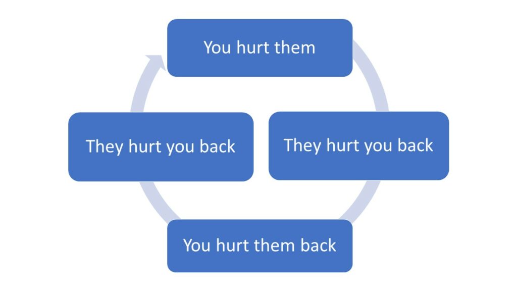 I call this the cycle of hurt. Once your partner feels hurt by something you say or do, they hurt you back. Defense is a natural reaction to being attacked. And the best way to defend is to attack back.